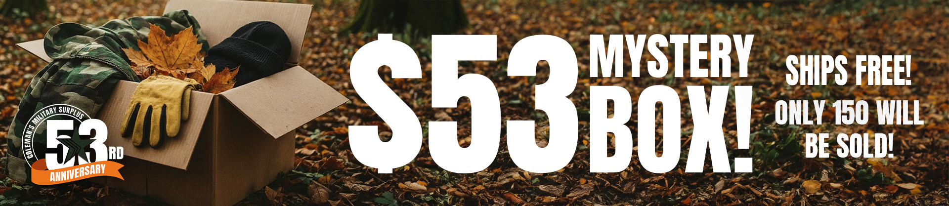 To mark our 53rd Anniversary, we’re launching something completely new: Coleman’s Mystery Boxes. Each box is packed with a unique mix of military surplus treasures carefully chosen from our warehouse. No two boxes are alike, making this a true collector’s event and a first in Coleman’s history.